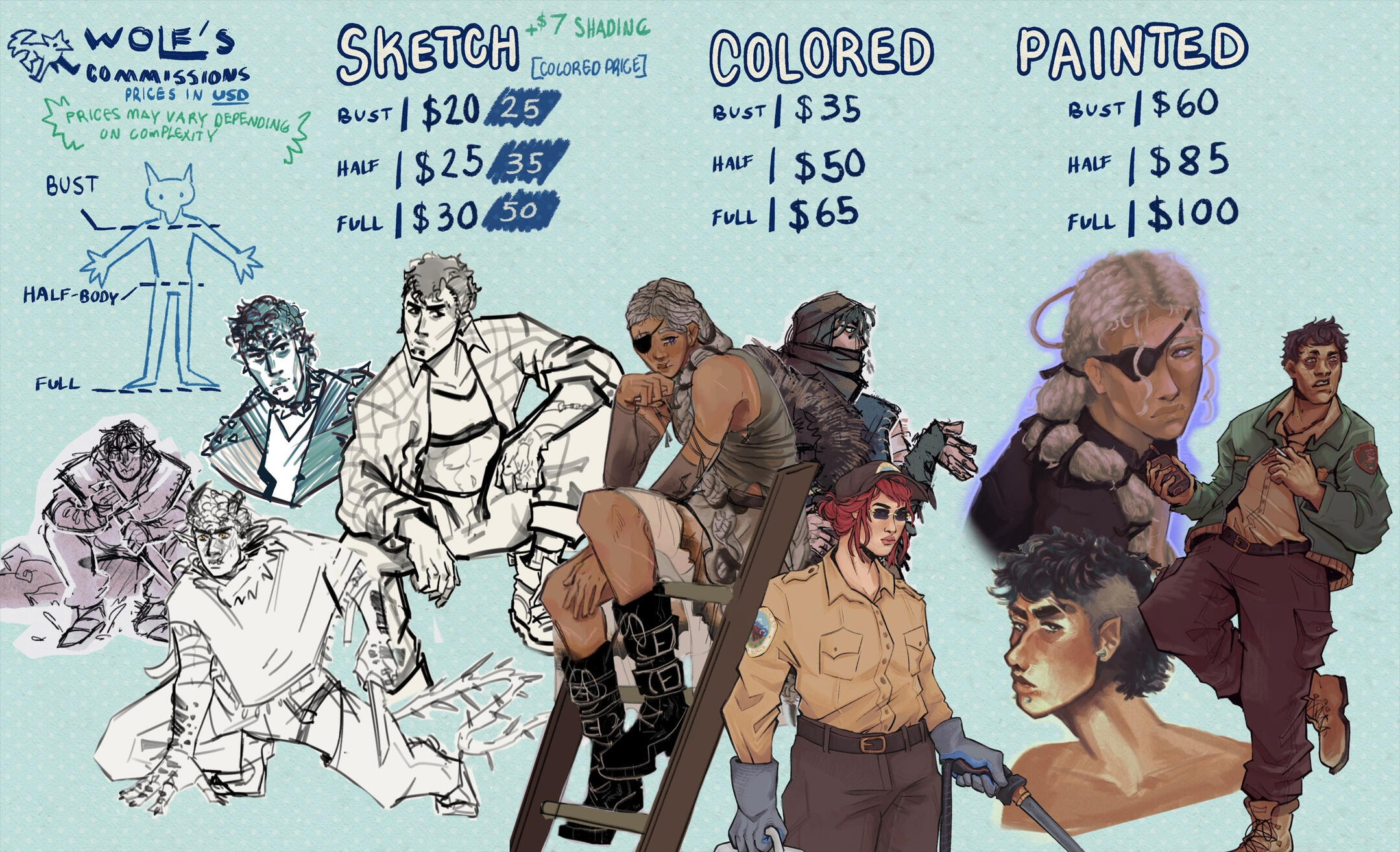 Payment can be done through Ko-Fi, Paypal, or Stripe (via Vgen).All prices are estimates that can vary depending on the specifics of a commission.Payment is done upfront. I will accept refunds only before a sketch has been submitted.